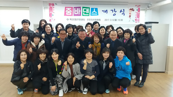 [세계로컬신문 이평래 기자] 울산시 중구 복산2동 주민센터는 6일 오후 다목적실에서 주민자치센터 프로그램 줌바댄스 개강식을 연 가운데 강사와 수강생 등 30여명이 단체로 기념촬영하고 있다.<사진제공=울산 중구청>