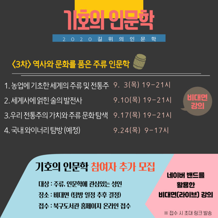 강의는 네이버 밴드를 활용한 비대면 온라인 강의로 진행되며, 인천의 인근 양조장 탐방이 계획되어 있으나 이는 상황에 따라 변동 혹은 취소될 수 있다.