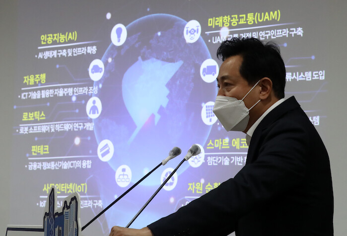 | ▲ 오세훈 서울시장이 26일 오전 서울시청에서 용산정비창 일대 용산국제업무지구 개발구상 브리핑을 하고 있다. (사진=뉴시스) |