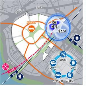 용산역과 인접한 부지에는 미래항공교통(UAM), GTX, 지하철, 도로 교통 간 쉽고 편리하게 환승할 수 있는 대중교통환승거점인 1호 ‘모빌리티 허브’를 조성한다.