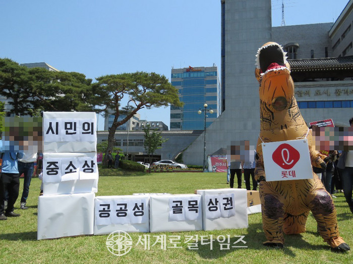 | ▲전북시민운동본부가 전주시청 앞 광장에서 종합경기장 개발계획과 관련해 지난 29일 퍼포먼스를 벌이고 있다. (사진=전북시민운동본부 제공) |