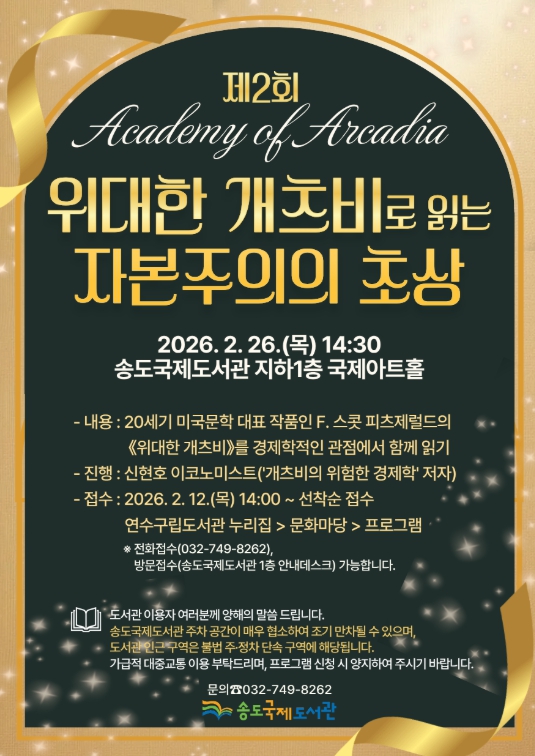‘아카데미 오브 아르카디아’는 세계문학을 중심으로 작품 속 주제와 시대적 맥락을 현대적 시선으로 재해석하는 성인 대상 인문교양 프로그램으로 송도국제도서관의 특화 프로그램이다.
