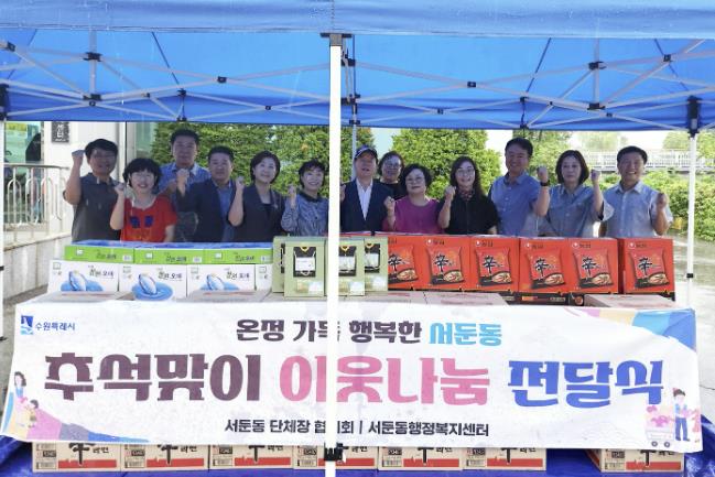 이번 추석맞이 이웃돕기에는 △주민자치회 △국토개발위원회 △통장협의회 △새마을 3단체 △지역사회보장협의체 △바르게살기위원회 등 관내 단체가 후원금을 사회복지공동모금회에 기탁하여, 서둔동은 사회복지공동모금회를 통하여 백미, 라면을 구입했다.