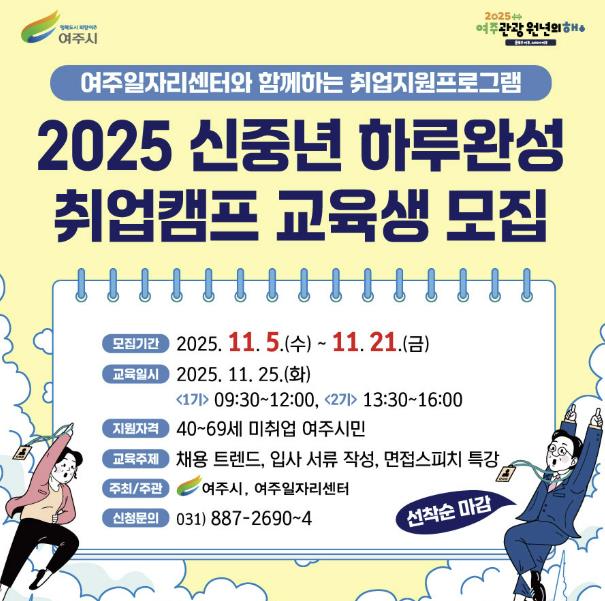 [세계로컬타임즈] 여주시는 오는 11월 25일 여주일자리센터에서 관내 40세부터 69세 미취업자 20명을 대상으로 ‘2025 신중년 하루 완성 취업캠프’를 운영한다.