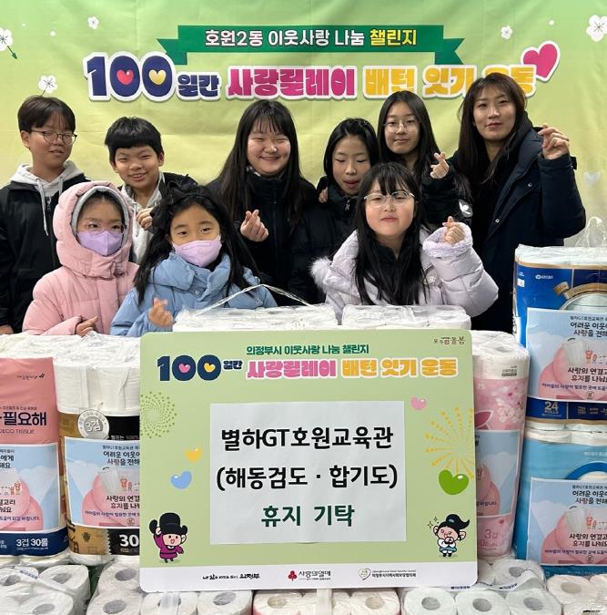 별하GT호원교육관은 매년 ‘100일간 사랑릴레이 배턴 잇기’에 참여해 라면과 생활용품 등 다양한 후원 물품을 기부해오고 있다. 이번에 휴지 또한 수련생들이 이웃을 생각하는 마음을 모아 함께 준비해 나눔의 의미를 더했다.