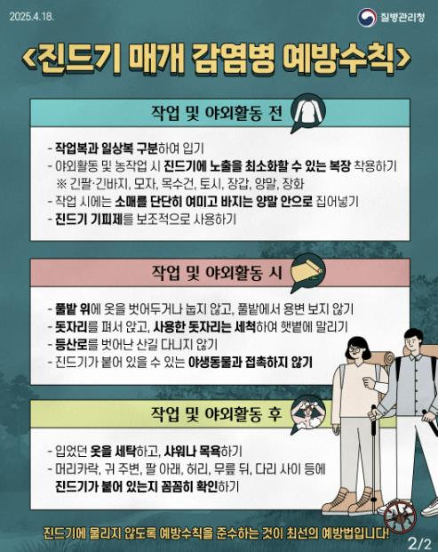 우리나라에서 발생하는 대표적인 진드기 매개 감염병은 털진드기에 의한 ‘쯔쯔가무시증’과 참진드기에 의한 ‘중증열성혈소판감소증후군(SFTS)’이 있다. 털진드기는 사람의 눈으로는 식별하기 어렵지만, 참진드기는 크기에 따라 눈으로 확인할 수 있다. 농경지, 농로, 주거지 주변 등 털진드기 주요 서식지와 참진드기가 많이 서식하는 산에서 활동하거나 야생동물과 접촉할 때 각별한 주의가 필요하다.