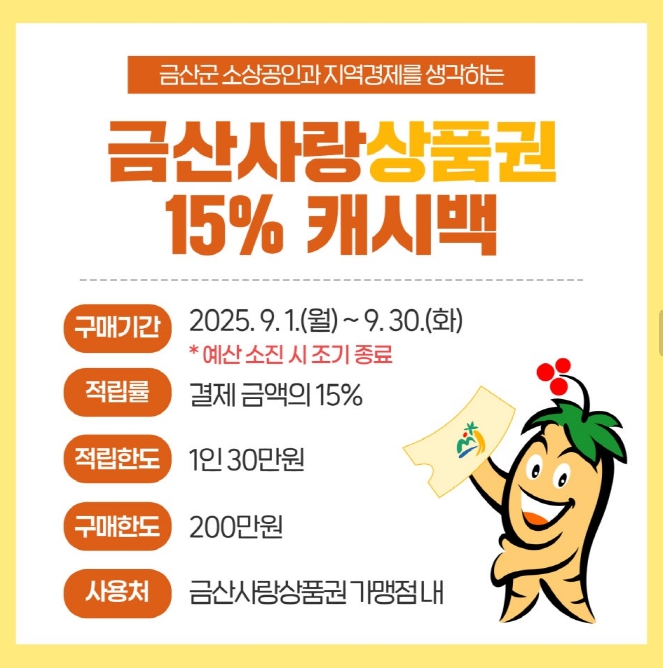군 관계자는 “금산사랑상품권 캐시백 적립은 소비만 해도 혜택을 받을 수 있다”며 “지역 경제 활성화에도 도움이 되는 상품권을 많이 이용해 주시길 바란다”고 말했다.