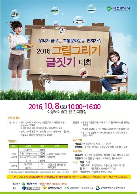 [세계로컬신문 온라인뉴스팀] 대전광역시(시장 권선택)는 오는 10월 8일 오전 이응노 미술관 앞 잔디광장에서 ‘우리가 꿈꾸는 교통문화운동 먼저가슈, 2016 그림그리기·글짓기 대회’를 연다고 26일 밝혔다.