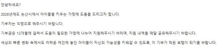 기부자는 이번 기탁금을 전달하며 “세상의 빠른 변화 속에서도 어려운 여건에 놓인 아이들이 자신의 가능성을 키워갈 수 있도록 보탬이 되고 싶다”는 진심 어린 마음을 전했다.