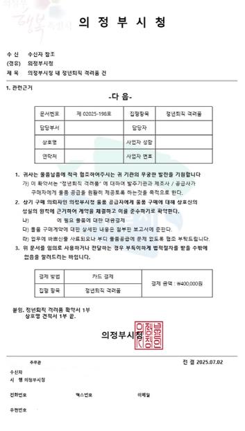 시 관계자는 “정식 공무원이 개인 계좌로 입금을 요구하는 일은 절대 없다”며 “위조된 명함, 공문, 계약서 등 수상한 문서를 수령했거나 사기 행위가 의심될 경우, 즉시 의정부시 또는 경찰에 신고해 달라”고 강조했다.