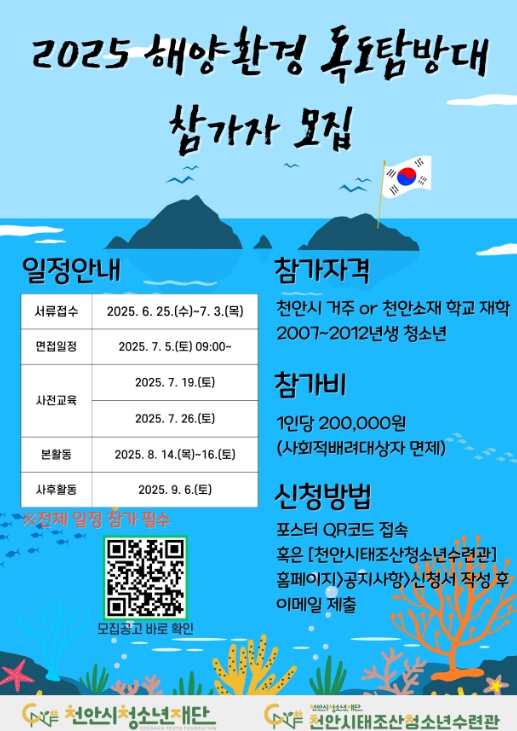 한상경 (재)천안시청소년재단 대표이사는 “이번 프로그램을 통해 청소년들이 해양환경을 직접 체험하고, 대한민국의 동쪽 끝인 독도를 방문하며 잊지 못할 추억을 쌓는 소중한 기회가 되길 바란다”고 말했다.