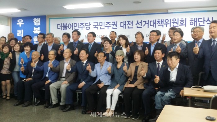 더불어민주당 국민주권 대전 선거대책위원회가 15일 대전시당 회의실에서 대선 승리를 자축하며 해단식을 가졌다. 선거위 관계자들은 자축의 시간을 가지면서도 검찰개혁과 내년 지방선거 승리 등을 위해 자만하지 말고 힘을 계속 모을 것을 다짐했다.