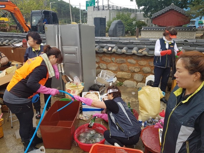 | ▲ 의용소방대원들이 진흙이 뒤범벅이 된 살림도구들을 씻고 있다. (사진=경북도 제공) |