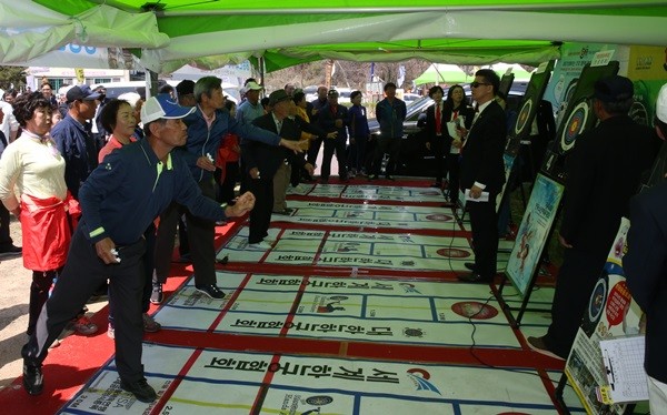 | ▲ 지난 16일 칠갑산장승공원에서 열린 한궁대회에 참가자들이 경기를 하고 있다.<사진제공=청양군청> |