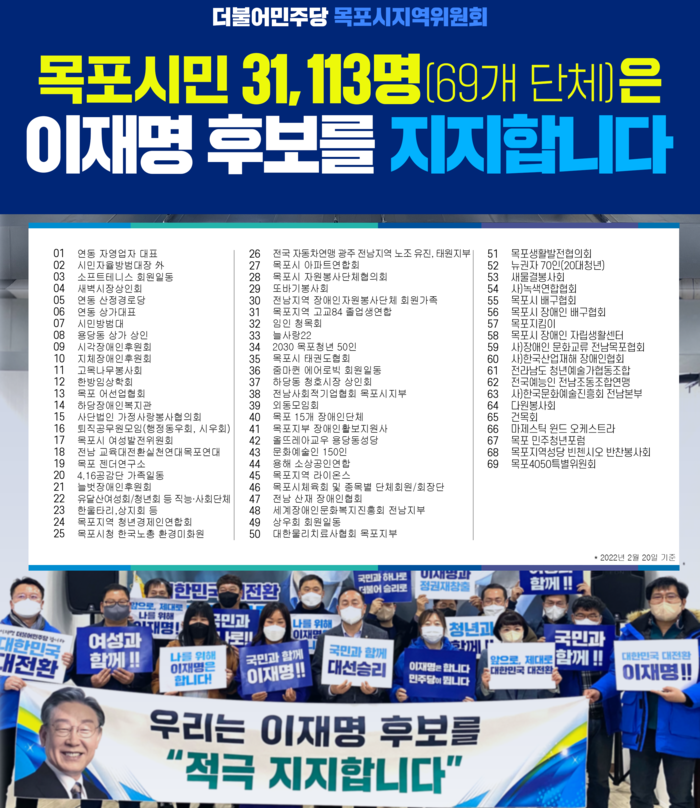 [세계로컬타임즈 김명진 기자] 더불어민주당 목포시지역위원회(위원장 김원이)는 각계각층의 목포시민으로 구성된 지역단체 등의 이재명 후보 지지선언이 이어져 20일 기준 69개 단체 등 총 3만1,113명이 지지선언에 동참했다고 22일 밝혔다.