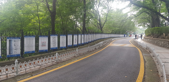 | ▲ 제1회 백범 김구 서예대전에서 입선한 작품이 자유공원에 전시되어 있다. (사진=인전중구 제공) |