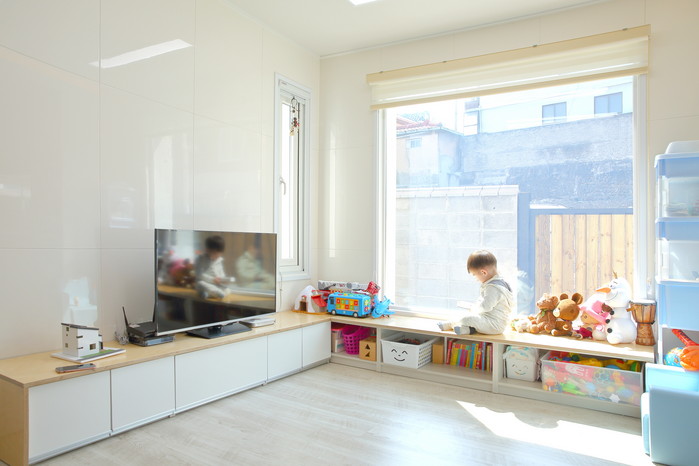개인공간인 2층에 놓인 아이방에는 복층 벙커침대를 만들어 공간을 위아래로 분리하고 외부에서는 보이지 않게끔 만든 중정형 테라스를 부부침실 옆에 만들어 티 타임을 즐길 수 있게 했다. 마당에는 접으면 주차가 가능하고 닫으면 마당으로 쓸 수 있는 6m 가까운 3단 접이문을 설치해 마당을 다양하게 활용할 수 있도록 했다.