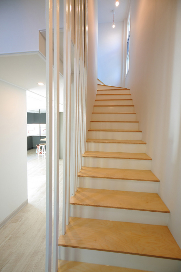 1층은 거실과 부엌, 다용도실을 만들어 공용공간으로 설계했다. 거실에는 픽스창을 둬 햇빛이 집 안으로 최대한 많이 들어올 수 있도록 했다. 부엌에는 무광택 그레이톤의 싱크대로 세련된 분위기를 연출했다. 좁은 집을 넓게 쓰기 위한 갖가지 아이디어가 돋보인다. 천장에 매달린 형태의 식탁을 자체 제작해 공간을 넓어보이게끔 꾸몄고 계단 밑과 현관 옆 신발장 뒤 공간을 간이 창고로 만들었다. 또 소파 대신 낮은 수납형 의자를 설치하고 계단 하부에 수납공간을 뒀다.