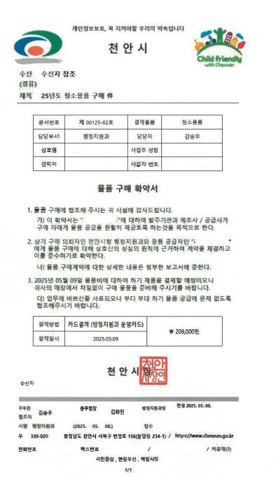 천안시는 최근 ‘시 공무원이 천안시 직인이 날인된 물품구매확약서를 제시하며 물품 납품을 요청했다’는 청소용품 판매 업자의 신고 전화를 접수했다.