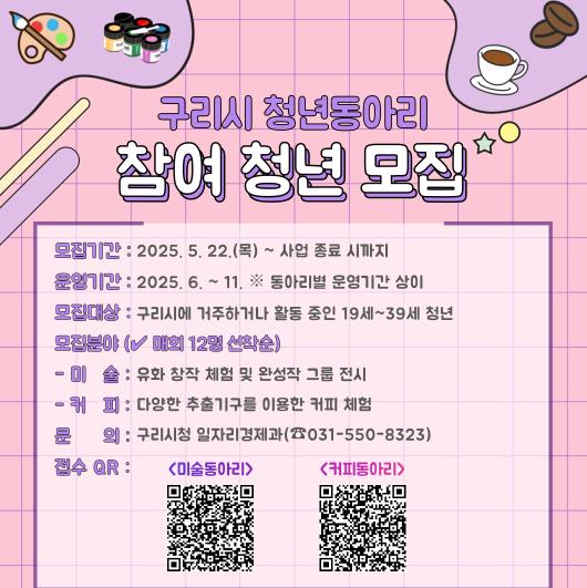 ‘구리시 청년동아리’는 청년들의 창의적이고 자율적인 활동을 지원하기 위한 사업으로, 올해 모집 분야는 ▲미술 활동과 예술적 교류를 중심으로 한 미술동아리 ▲다양한 추출 기구를 활용한 체험 중심의 커피 동아리이다.