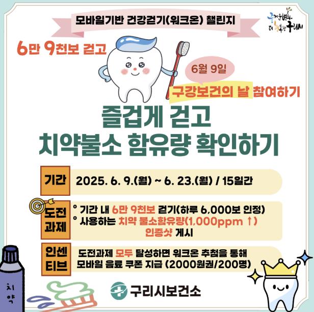 백경현 구리시장은 “불소가 함유된 치약 사용은 충치 예방의 첫걸음이므로, 소중한 가족과 함께 올바른 칫솔질을 실천하고 걷기 습관을 생활화해 대사질환을 예방하는 건강한 일상을 이어가길 바란다.”라고 말했다.