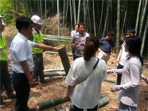▲ 에버랜드 동물원 관계자들이 지난 9일 경남 하동 대나무 재배지를 찾아 판다 먹거리 채취장 상태를 확인하고 있다. <사진제공=하동군산림조합> |