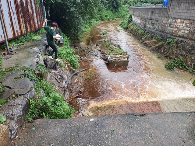 | ▲ 안양천 유역에서 폐수배출 시설의 방류수를 채취하고 있다. (사진=안양시 제공) |