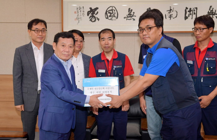 19일 광주시에 따르면 지난 18일 오전 금호타이어 노조(대표지회장 허용대)와 만나 매각과 관련해 고용 보장과 지속발전을 위한 국내 설비투자 확대 등 내용을 담은 시민 1만여 명의 서명부를 전달받았다.