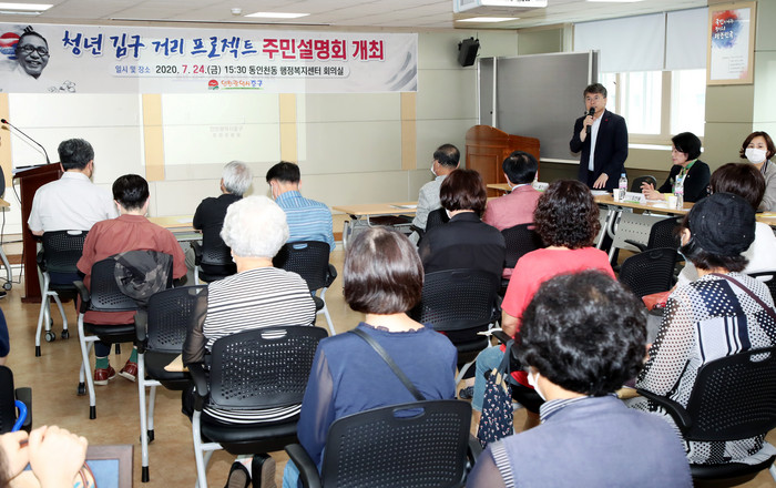 구는 최근 신포동 및 동인천동 행정복지센터 회의실에서 ‘청년 김구 거리 프로젝트’의 주민설명회를 개최했다고 27일 밝혔다. 이번 설명회는 홍인성 구청장을 비롯해 주민들과 프로젝트 자문단이 참여한 가운데 프로젝트 주요 내용에 대해 설명하고 주민들의 다양한 의견을 청취하기 위해 마련됐다는 설명이다.