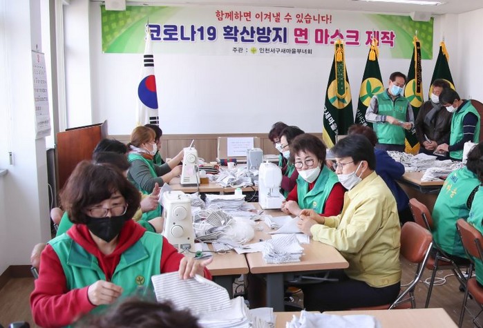 인천 서구 새마을부녀회는 코로나19 확산으로 마스크 구입에 어려움을 겪고 있는 취약계층에 전달하기 위해 면마스크 1천5백 매를 제작했다.
