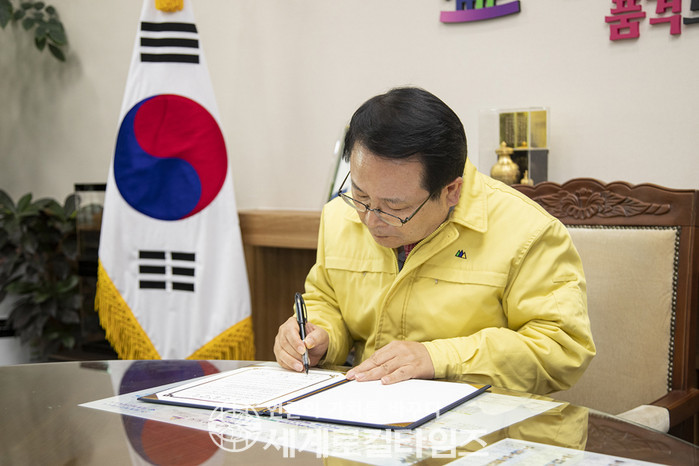 | ▲정헌율 익산시이 장협약서에 서명하고 있다. (사진=익산시 제공) |