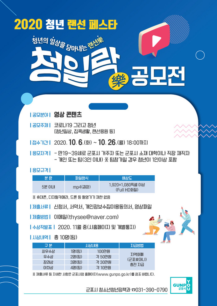 [세계로컬타임즈 심상열 기자] 군포시는 코로나19로 바뀐 청년들의 일상생활을 담아 희망의 메시지를 전하기 위한 동영상 공모전 ‘청년 랜선 페스타 청일락’을 실시한다.