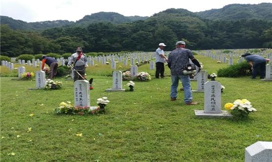 | ▲ 제주시 충혼묘지에서 관계자들이 추석을 앞두고 벌초작업을 펴치고 있다.<사진제공=제주시청> |