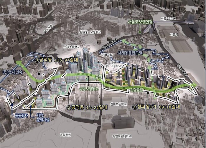 ▴청파동1가 89-18일대의 동서간 도로 및 가로공원 조성, ▴공덕동 11-24일대의 공원 및 공공보행통로 배치 ▴공덕동 115-97일대의 공공보행통로 등을 통해 서측만리재로와 동측 청파로간 좁고 급경사 도로 정비 및 보행·녹지축을 연계하는 통합적 기반시설 계획을 마련했다.