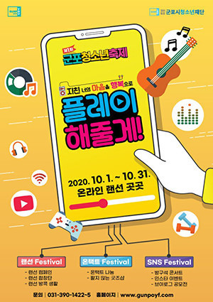 군포시청소년재단 주관으로 오는 31일까지 진행되는 이번 청소년축제는, 슬로건 공모전 당선작인 ‘지친 너의 마음을 행복으로 플레이 해줄께’라는 주제로 ‘랜선 캠페인’, ‘랜선 합창단’, ‘랜선 방콕생활’, ‘온택트 청소년 나눔’, ‘방구석 콘서트’, ‘브이로그 공모전’ 등 다채롭게 선보인다.