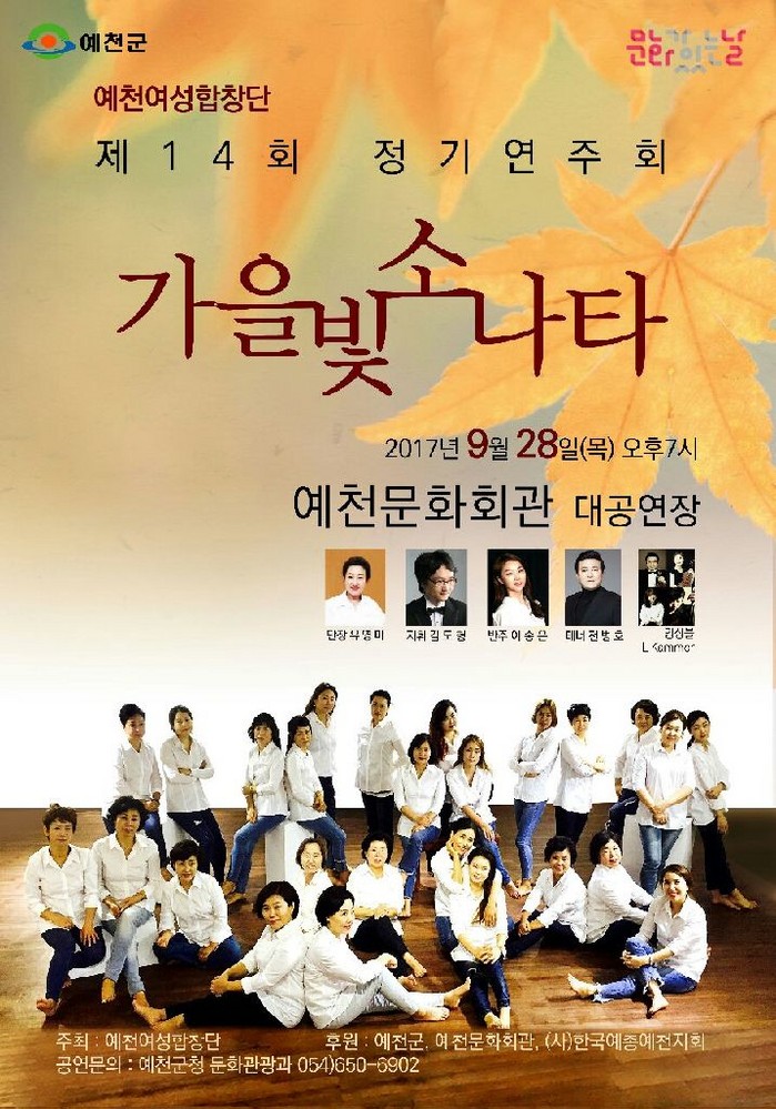 [세계로컬신문 이종학 기자] 경북 예천여성합창단이 28일 오후 7시 예천군 문화회관에서 '가을빛 소나타'라는 주제로 제14회 정기연주회를 갖는다.