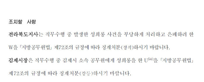 [세계로컬신문 조주연 기자] 전북 김제시가 '성희롱을 한 C 국장을 징계(강등) 하라'는 감사원의 요구를 받아 들여 전라북도 인사위원회에 징계의결을 요구한 것으로 확인됐다.