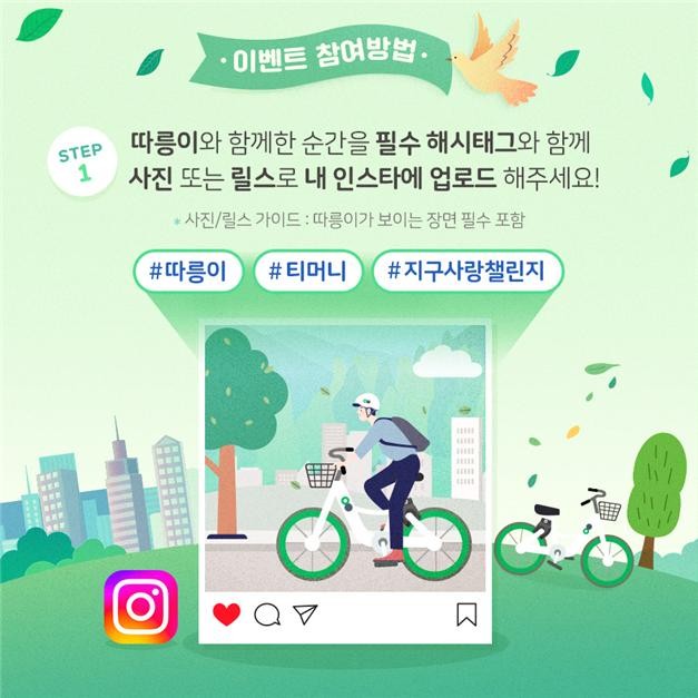 필수 해시태그는 '#따릉이', '#티머니', '#지구사랑챌린지'이며, 해시태그 참여 후 ‘티머니’ 인스타그램에 참여 완료 댓글을 남기면 된다.