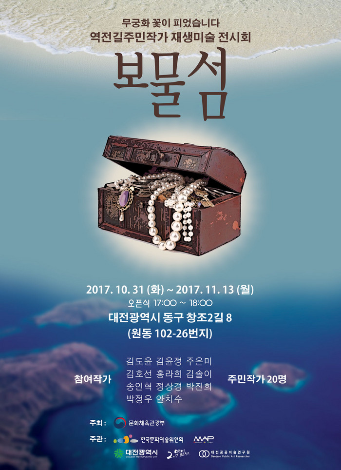 시 관계자는 “보물섬 전시회는 주민이 참여해 작가와 협업한 첫 번째 전시회로, 앞으로‘무궁화 꽃이 피었습니다’프로젝트를 통해 대전역전길 주변이 아름다운 생활문화예술마을로 변화되도록 적극 지원하겠다”고 말했다.