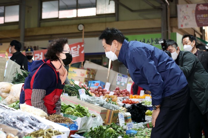 | ▲오세훈 서울시장이 8일 오전 서울 서대문구 홍제동 인왕시장을 방문해 시장 상인과 인사를 나누고 있다. (사진=뉴시스) |