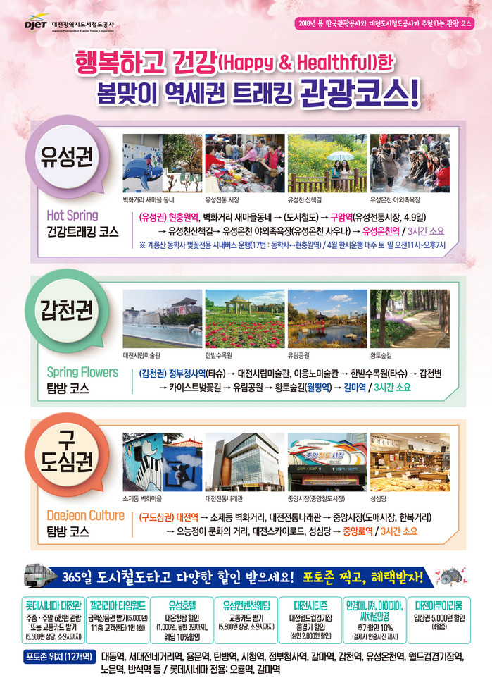 공사가 개발한 3개 코스는 도시철도가 지나는 중구, 서구, 유성구의 대표적인 명소를 포함하고 있어 4월 벚꽃시즌과 5월 가정의 달에 가족 단위로 움직일 수 있는 최적의 도심 트래킹 코스가 될 것이라고 공사 관계자는 설명했다.
