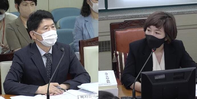 | ▲ 서울시 복지정책실장(사진 왼쪽)에게 질의하고 있는 김경 의원. (사진=의원실) |