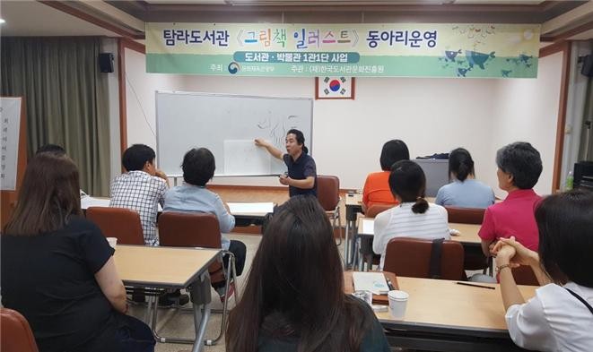 | ▲ 지난해 탐라도서관에서 '그림책 일러스트' 동아리에 참여한 시민들이 화가의 강의를 듣고 있다.<사진제공=제주시청> |