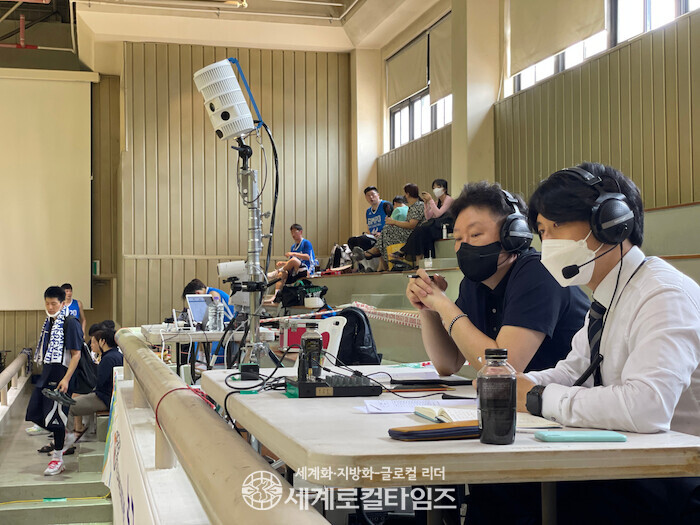| ▲ 농구경기장에 설치된 AI 스포츠 중계 카메라와 캐스터 중계 장면 (사진=용인시) |