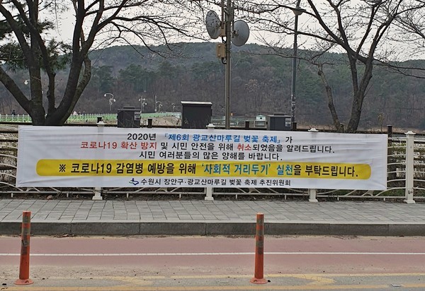 1일 수원시에 따르면 광교마루길·서호천·만석공원·황구지천·장안공원·화서공원·여기산공원 봄꽃을 보기 위해 오는 시민들 밀집 예상 지역에 벚꽃 축제 등이 취소됐다는 내용의 현수막을 설치했다. 이는 4월에 봄꽃을 즐기려는 시민들에게 사회적 거리두기를 실천하게 하기 위함이다.