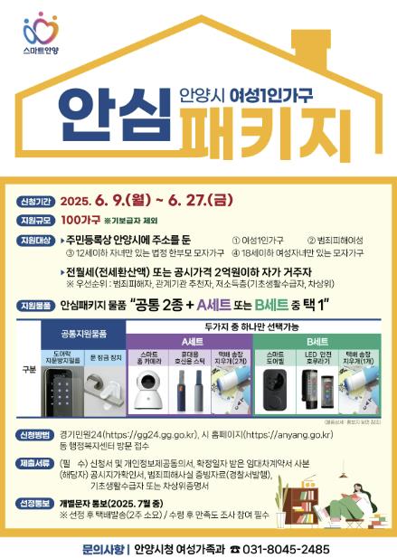 지원대상은 안양시에 주민등록을 둔 여성 1인 가구 또는 범죄피해여성, 12세 이하 자녀로 구성된 법정 한부모 모자가구, 18세 이하 여성자녀만 있는 모자가구 등이다.