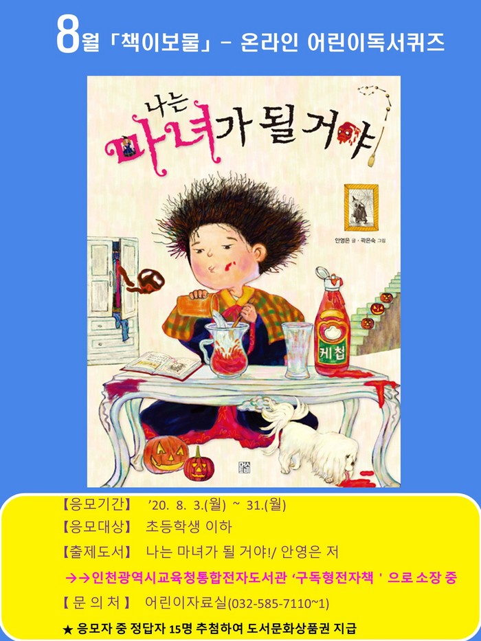 | ▲ 8월 '책이 보물' 온라인 어린이 독서퀴즈 홍보 포스터. (자료=인천시교육청 제공) |