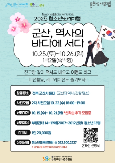 부평에 거주하거나 재학 중인 14~19세 청소년이 대상인 이번 프로그램은 전라북도 군산의 근현대사 유적지를 탐방하며, 역사적 현장을 직접 체험할 수 있는 1박 2일 숙박형 활동으로 구성된다.