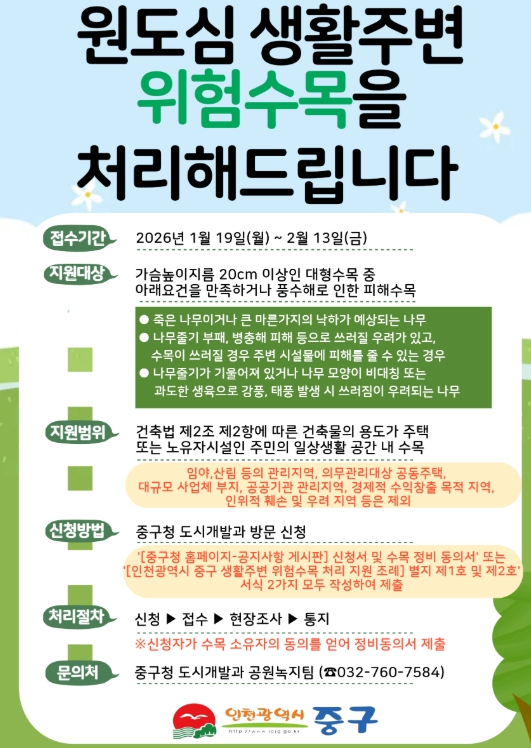 위험 수목 처리를 희망하는 주민은 1월 19일부터 오는 2월 13일까지 중구청 도시개발과 공원녹지팀을 방문해 신청서와 수목 정비 동의서를 제출하면 된다.