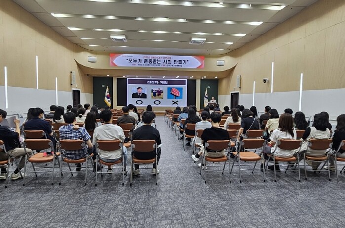 이번 교육은 관련 법에 따라 연 1회 이상 의무적으로 실시되는 법정 교육으로, 실로암 시각장애인복지회 소속의 김태현 전문 강사를 초빙해 ‘모두가 존중받는 사회 만들기’를 주제로 진행됐다.